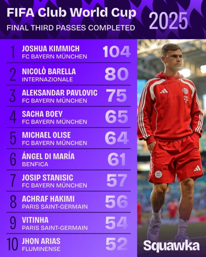 直播吧6月23日讯据Squawka数据统计,在世俱杯中,基米希目前是唯一在进攻三区完成超过100次传球的球员。