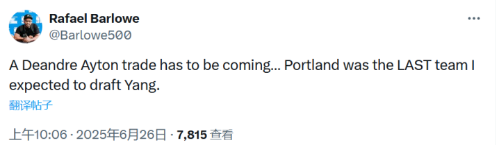 在被选中之后,杨瀚森十分激动,他说道:“这肯定被吓到了,非常激动,开拓者去中国看我,是第一支试训我的队伍,在那里很开心。试训也经历了很多,但很充实。生日安排是出去吃顿饭,感谢一直以来支持我、鼓励我的球迷朋友。”值得一提的是,开拓者队也是杨瀚森第一支试训的球队。